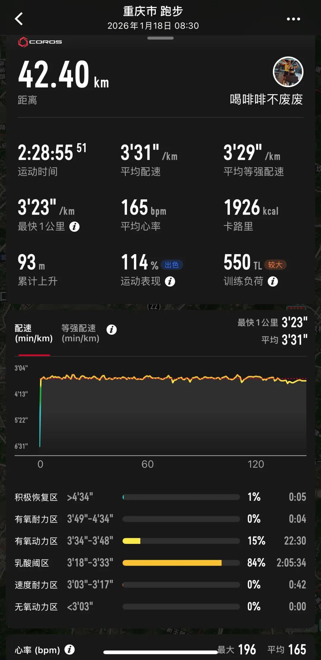 后来我们考虑南半是本地赛事,就去跑着玩一下。那个成绩得益于罗源,他一开始跟我说慢一点起步330,结果他跑出去就32几的配速,一下子把我配速带快了。南半我跑了两次,知道前半程有爬升但很小,我说前面跑快一点,后半程给自己留个掉速的空间。可能跑个75、74分。后来上赛道了我说那就冲一下,跑崩都无所谓,我前面就一直猛干。