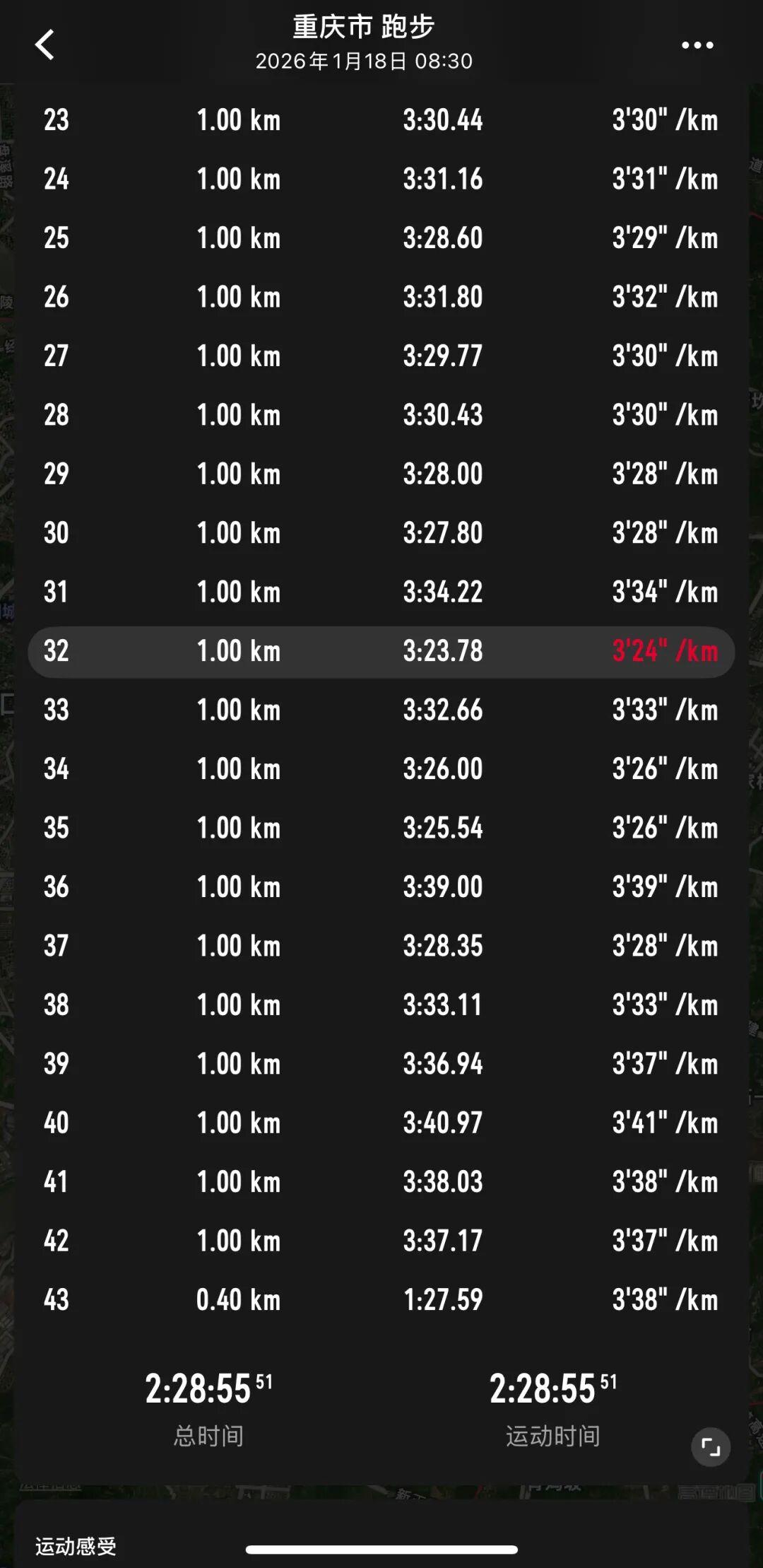 A第一反应——以后比赛策略还是得稳住,不能加太急,以后比赛慢慢攒经验,不要着急中间突然加速。我们也可能调整一下策略,或下次比赛尝试一下,努力到36或37公里后再加速更保险一点。我希望一场比赛能以比较好体感跑下来,不是到后半程要顶一公里。